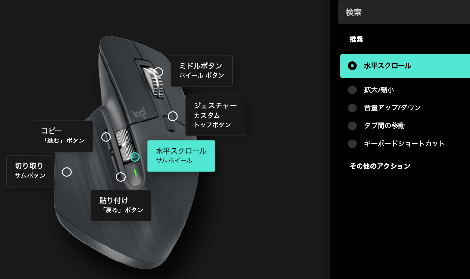 一方、MX Master 3S はサムホイール1つで水平スクロールを実現できるため、サムホイール以外に 5つのボタンをカスタマイズ可能です。