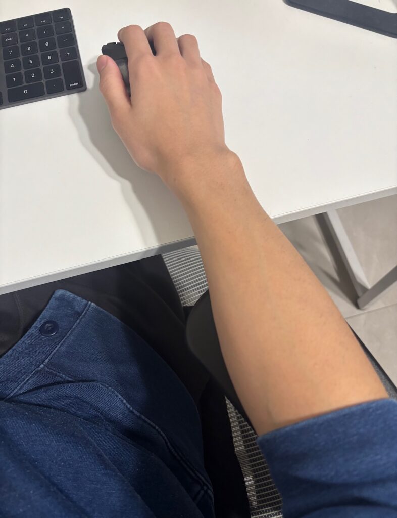 トラックボールであれば下記画像のように腕をチェアの肘掛けに置き、腕を動かさずに指先だけでマウス操作ができます。